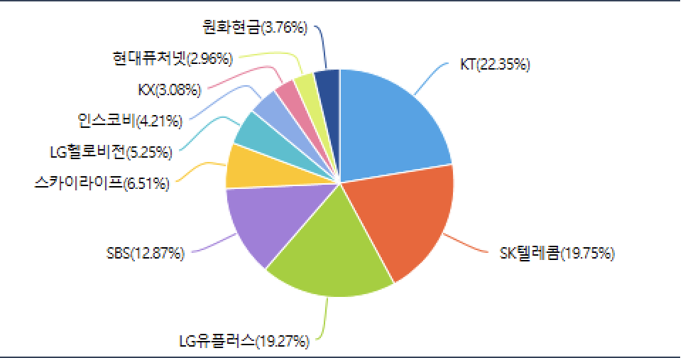 - TIGER 방송통신 : KT, SK텔레콤, LG유플러스, SBS, 스카이라이프, LG헬로비전, 인스코비, KX, 현대퓨처넷