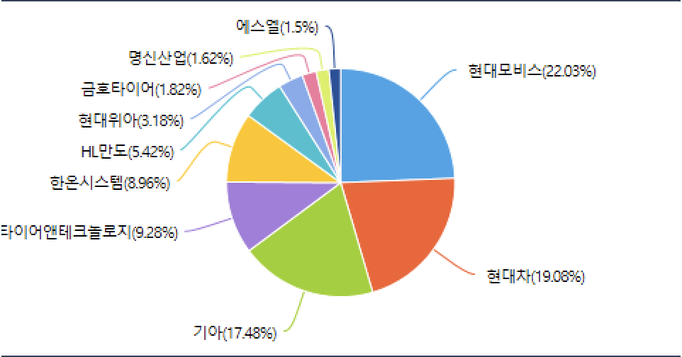 - KODEX 자동차 : 현대모비스, 현대차, 기아, 한국타이어앤테크놀로지, 한온시스템, HL만도, 현대위아, 금호타이어, 명신산업, 에스엘