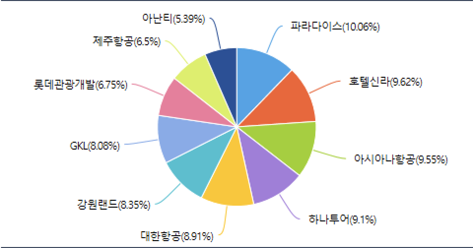 - TIGER 여행레저 : 파라다이스, 호텔신라, 아시아나항공, 하나투어, 대한항공, 강원랜드, GKL, 롯데관광개발, 제주항공, 아난티