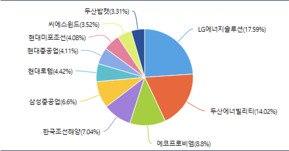 - KODEX 기계장비 : LG에너지솔루션, 두산에너빌리티, 에코프로비엠, 한국조선해양, 삼성중공업, 현대로템, 현대중공업, 현대미포조선, 씨에스윈드, 두산팝캣