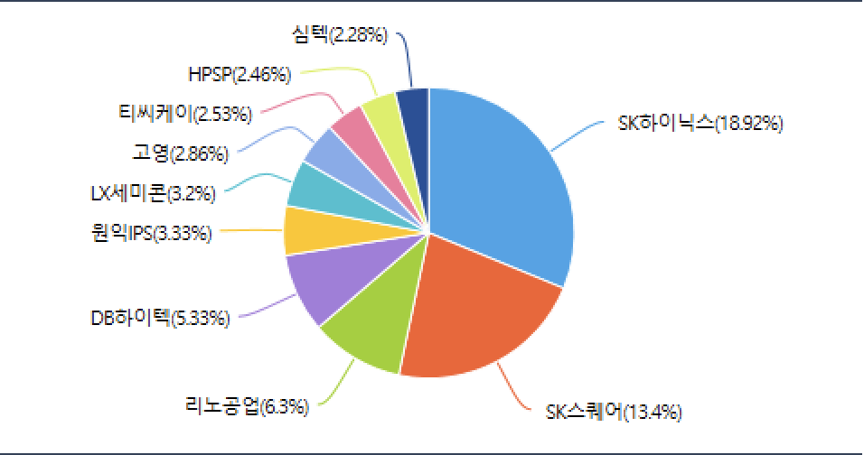 - KODEX 반도체 : SK하이닉스, SK스퀘어, 리노공업, DB하이텍, 원익IPS, LX세미콘, 고영, 티씨케이, HPSP, 심텍