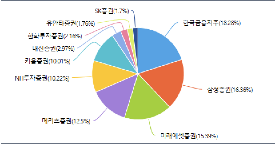• KODEX 증권 : 한국금융지주, 삼성증권, 미래에셋증권, 메리츠증권, NH투자증권, 키움증권, 대신증권, 한화투자증권, 유안타증권, SK증권