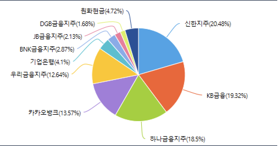 - KODEX 은행 : 신한지주, KB금융, 하나금융지주, 카카오뱅크, 우리금융지주, 기업은행, BNK금융지주, JB금융지주 ,DGB금융지주