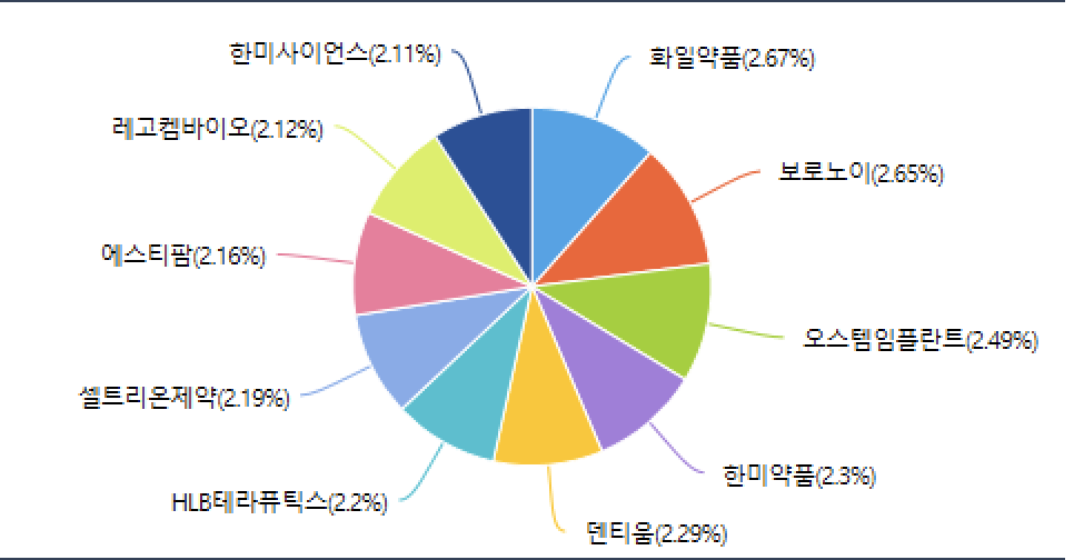 • KODEX 바이오 : 화일약품, 보로노이, 오스템임플란트, 한미약품, 덴티움, HLB테라퓨틱스, 셀트리온제약, 에스티팜, 레고켐바이오, 한미사이언스