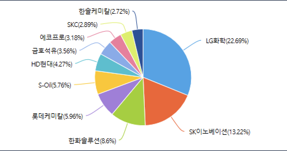 - KODEX 에너지화학 : LG화학, SK이노베이션, 한화솔루션, 롯데케미칼, S-Oil, HD현대, 금호석유, 에코프로, SKC, 한솔케미칼