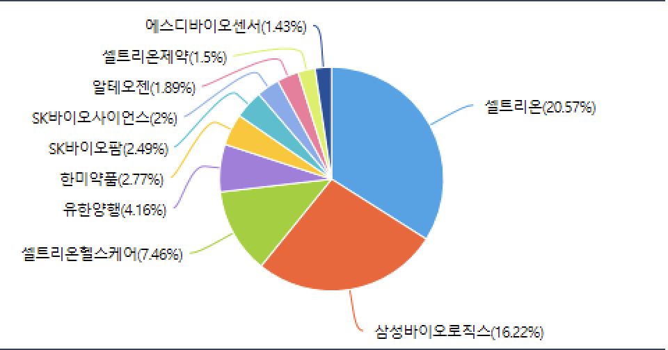 - KODEX 헬스케어 : 셀트리온, 삼성바이오로직스, 셀트리온헬스케어, 유한양행, 한미약품, SK바이오팜, SK바이오사이언스, 알테오젠, 셀트리온제약, 에스디바이오센서