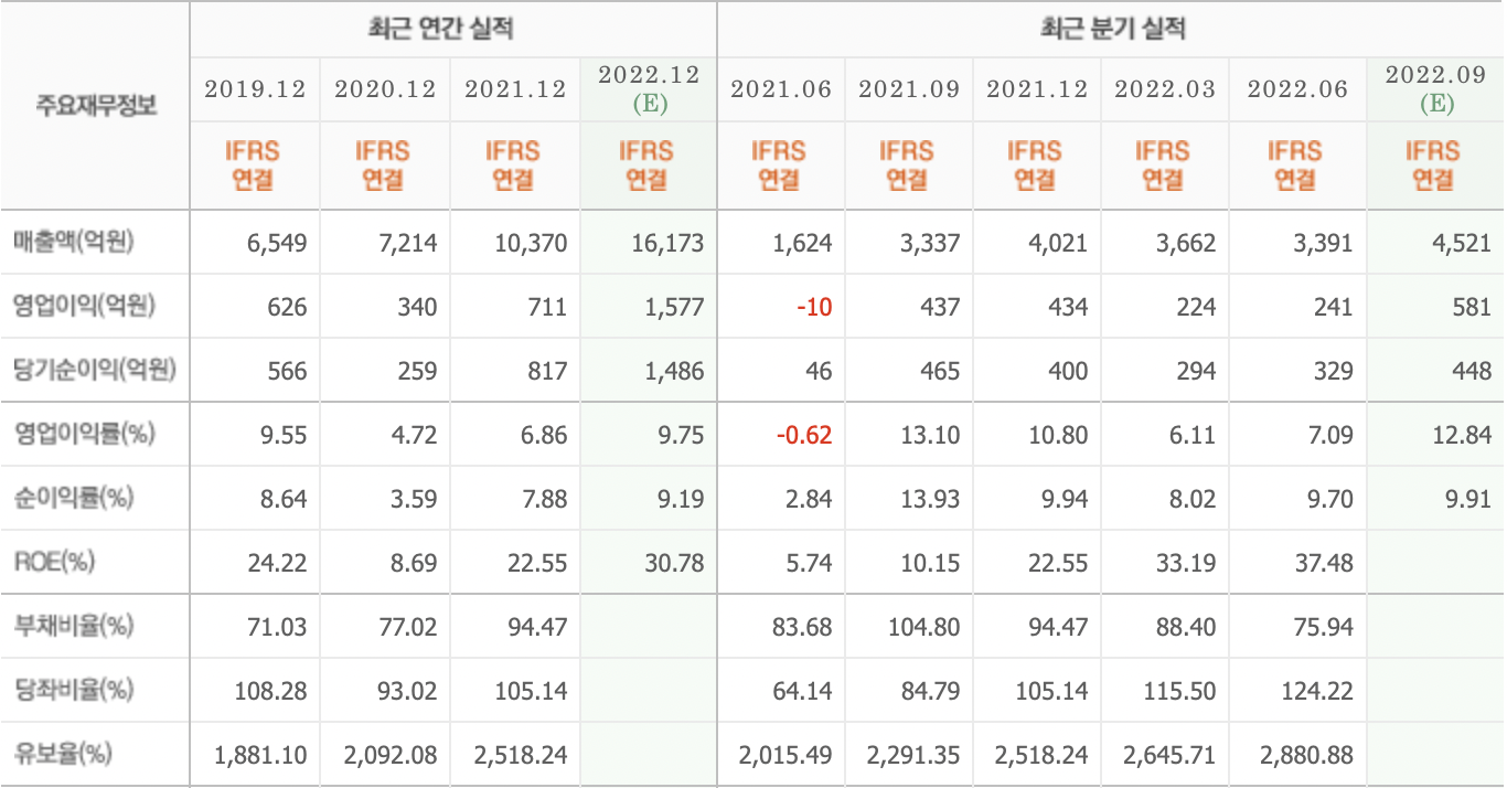 • 2021년 영업이익이 2019년 대비 증가하였고, ROE 22.55% 기록하였습니다. 2 분기 영업이익은 작년 동기 적자 기록한 것과 비교하면 크게 상승하였고, 올해 예상 실적은 ROE 30.78% 까지 예상 하고 있습니다.