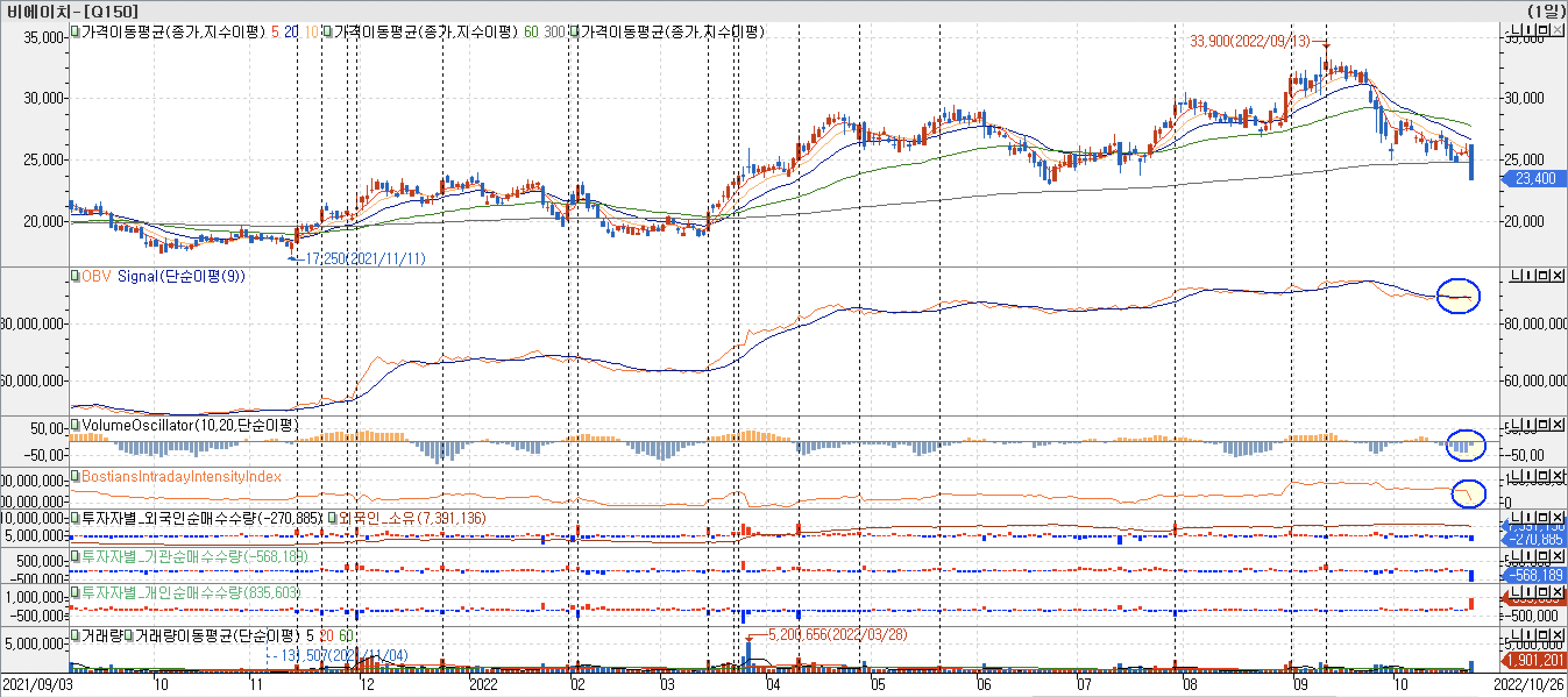 [3. 봉 차트 - OBV, VolumeOscillator, BIII, 외국인, 기관 개인 매수]