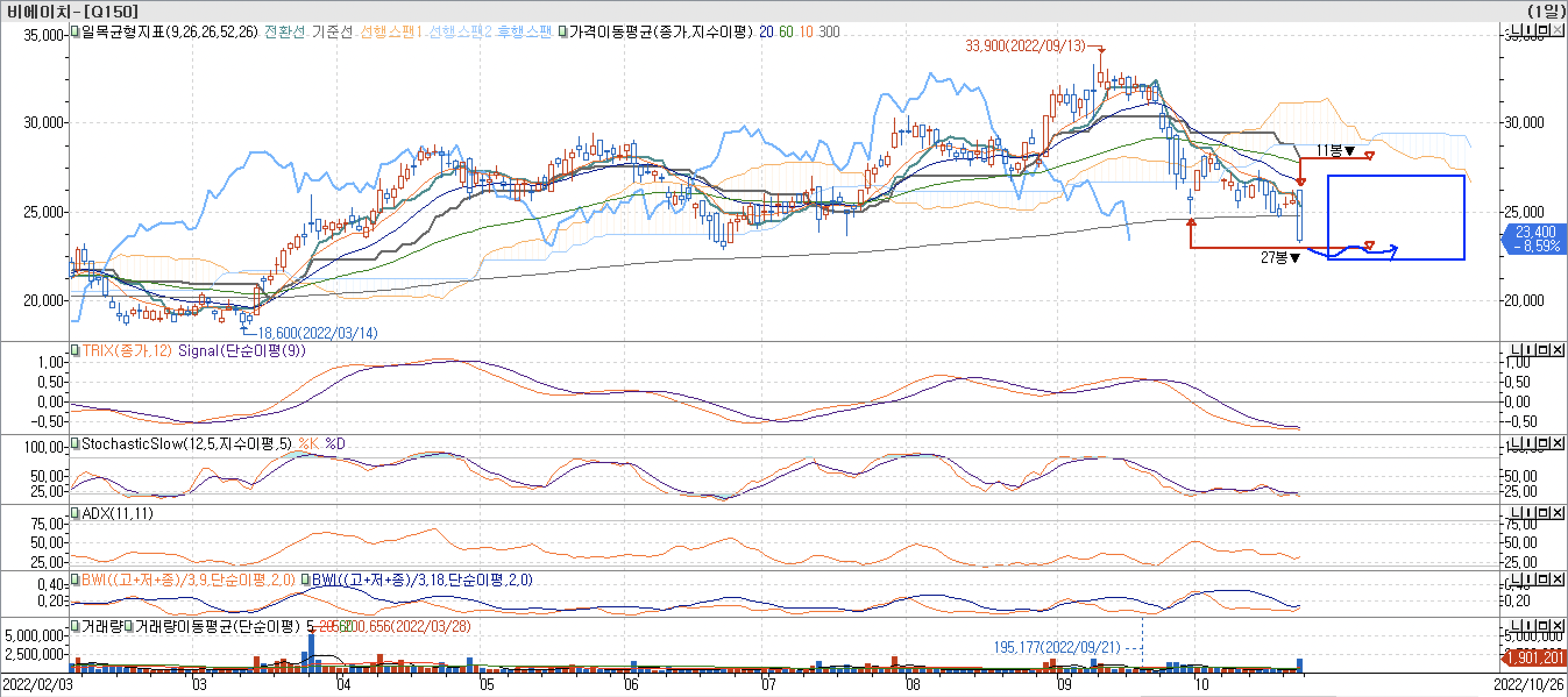 • TRIX지표는 9월 말부터 이미 하락 전환한 상태이고, StochasticSlow도 침체 구간 진입 한지 꽤 됐기 때문에 이미 하락 추세에 진입한 상태였습니다. 그런데, 장대음봉 출현하면서 300일 이평선을 깨는 급락이 나온 상태입니다.