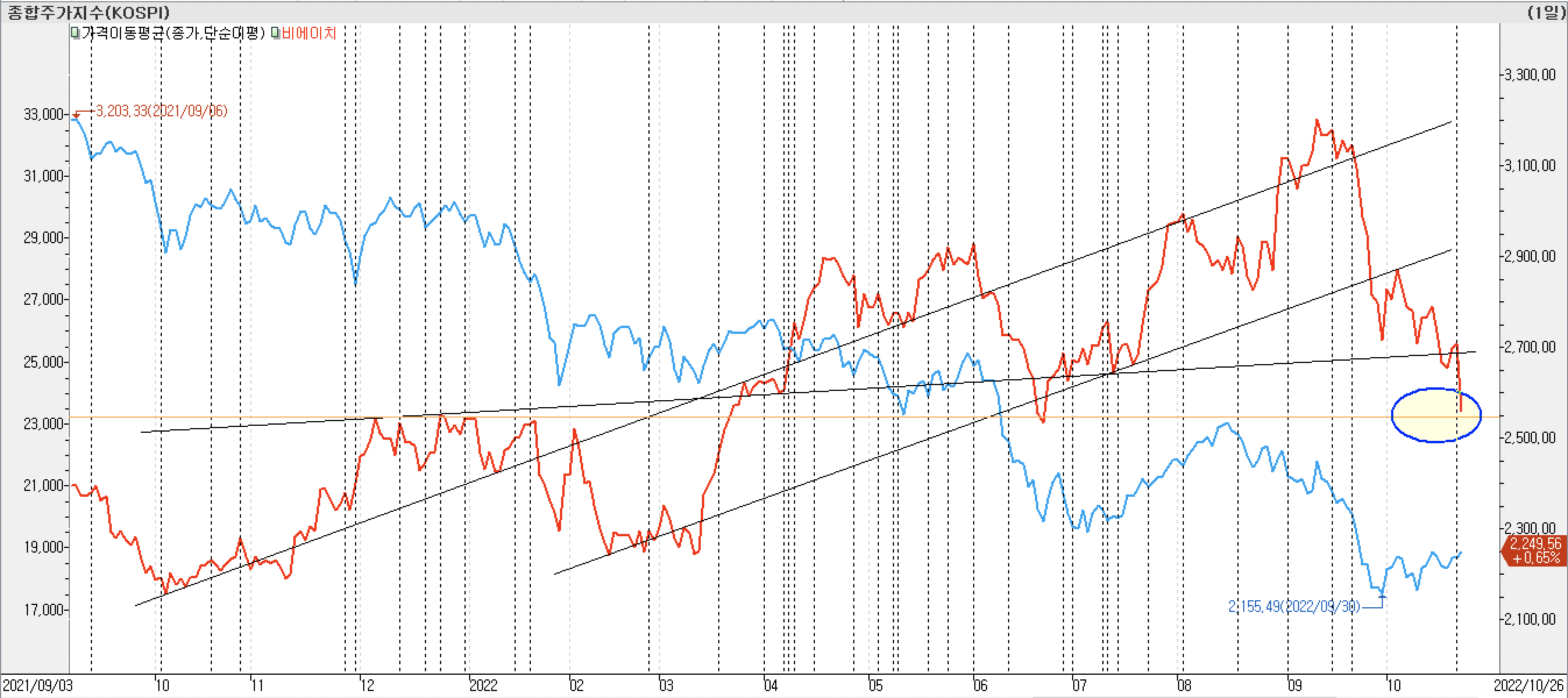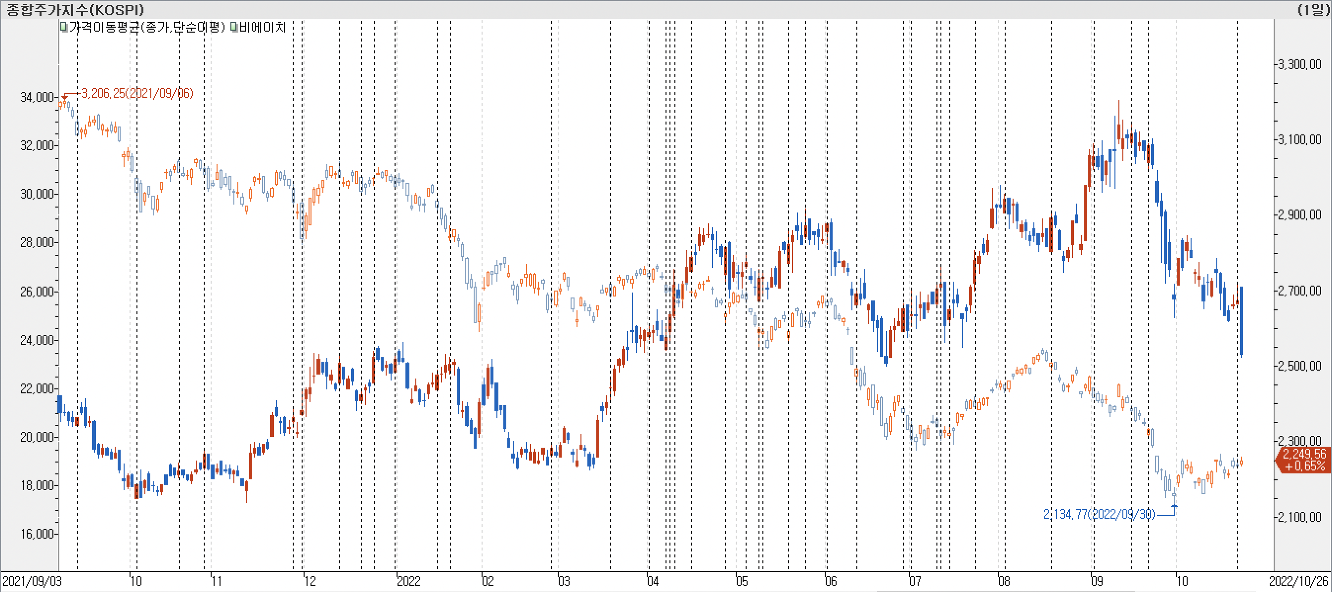 • 종가선 차트를 보면 작년 말과 올해 초에 쌍바닥을 형성 한 이후 시장 지수를 강하게 돌파하였습니다. 그리고 9월 신고가 형성 후 급락하였고, 6월 저점 부근까지 하락한 상태입니다.