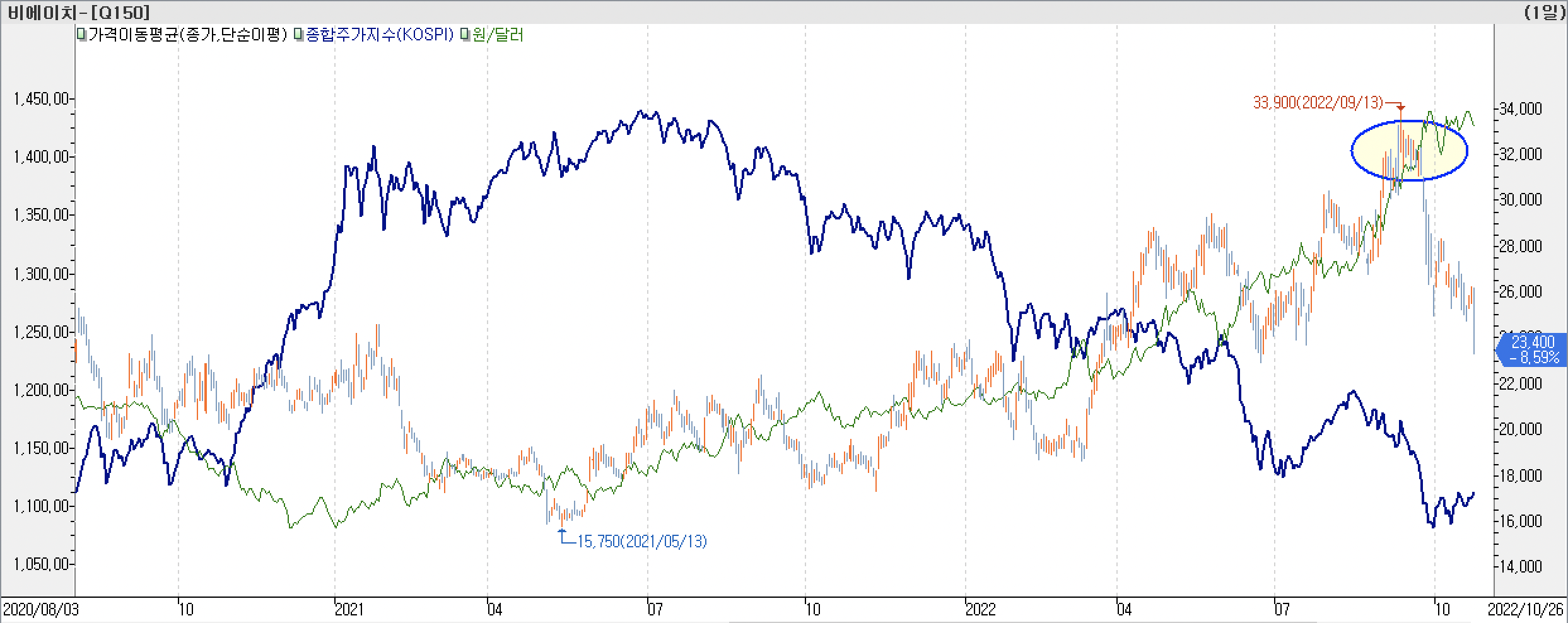 • 비에이치는 환율과 커플링 되면서 움직였던 환율 수혜주로 보입니다. 환율 상승 구간에서 같이 상승하였고, 환율 고점을 지나 박스권 횡보 구간으로 들어갈 때 급락하면서 하락하였는데, 가격 고점이 명확했던 상황이었습니다. 비에이치의 고점 구간은 지수의 직전 고점 구간이기도 합니다.