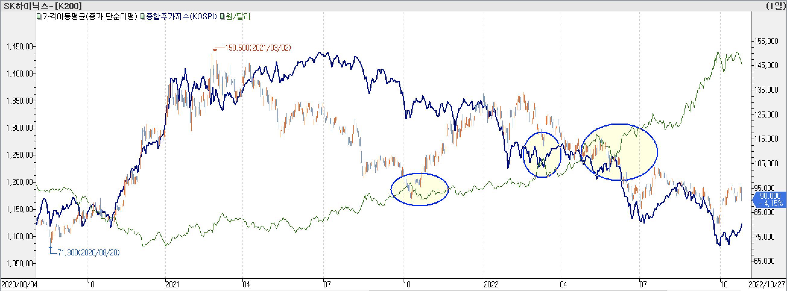 - 올해 3월 에 환율이 짧은 기간 급등했을 때 같은 구간 SK하이닉스는 단기 급락 후 변곡 형성하면서 반등하였고, 6월에 환율이 본격적으로 급등 하자 주가가 확실히 꺾이면서 하락 하락하였습니다.