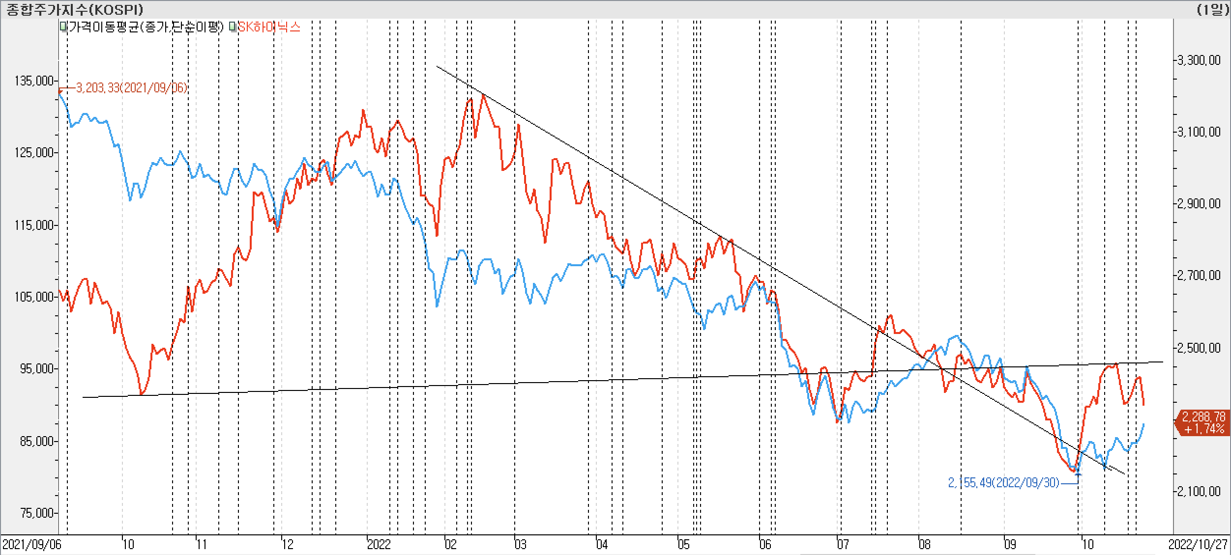 - 종가선 차트에서 보면 올해 3월 이후부터 하락하던 추세에서 반등에는 성공한 것으로 보입니다. 하지만 작년 10월 저점 구간에서 만들어지는 저항선을 돌파하지 못하고 박스권 횡보 움직임일 보이고 있습니다.