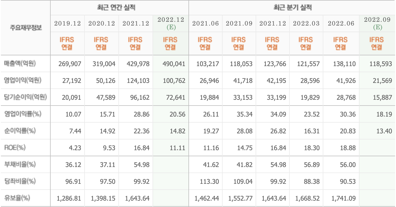 - 주요 재무정보에서 CAPEX 투자가 2020년 감소하였으나 2021, 2022년 지속 상승하고 있습니다. 그리고 영업활동 현금흐름이 2020년 이후 상당히 좋아지고 있습니다.