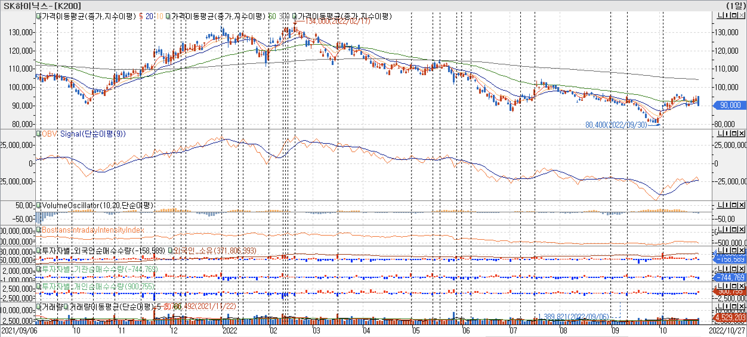 - OBV 지표를 보면 주가 흐름과 비슷하게 거래 활성도 추세가 하락하고 있습니다. 그리고 9월 저점을 찍고 주가가 반등하면서 같이 상승하고 있습니다.