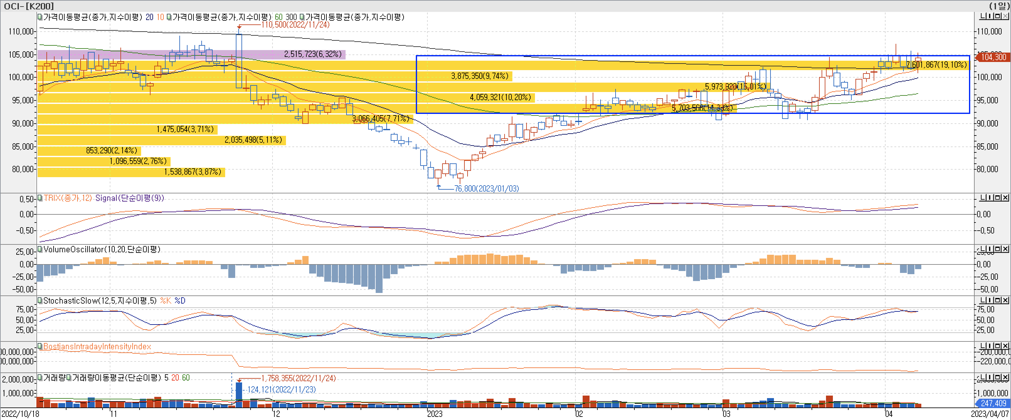 - 매물대차트를 보면 OCI의 현재 가격대에 매물대가 집중되고 있는 것이 확인됩니다. 300일 이평선 돌파시도 하다가 최근 돌파 후 횡보 하고 있는데, 점진적 상승하면서 형성된 하단 매물대가 아직 두껍게 형성된 있기 때문에 일정기간은 하단 매물대 소화 기간이 필요할 것으로 보입니다.