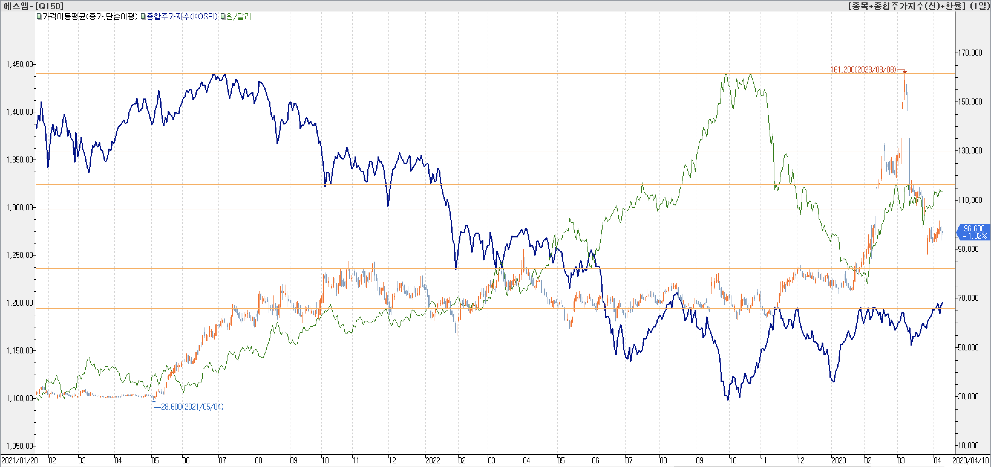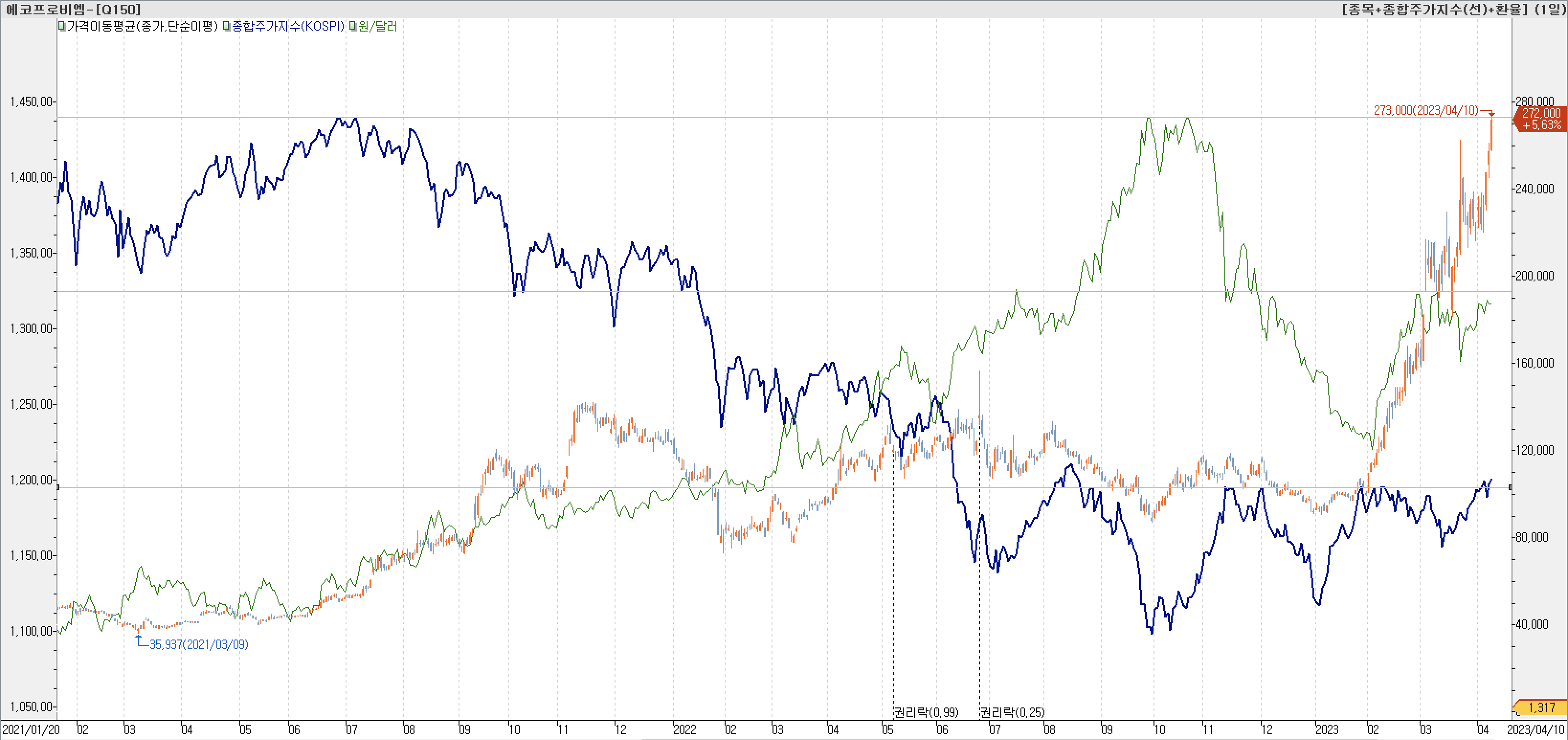 시장지수, 환율, 에코프로비엠을 상대 비교 해봤을 때 최근 직전 고점이 환율과 시장지수 최고점자리입니다. 종목 차트를 돌려 보다 보면 대체로 환율이나 시장지수 직전 고점 자리를 돌파했던 경우는 2022년 환율이 하단에 있고, 시장지수 고점 횡보 자리의 경우가 많았습니다. 그런데 시장지수 하락 국면에서 환율과 골든 크로스 발생한 이후부터는 환율의 상대적 높이가 저항선으로 작용하고 있습니다.