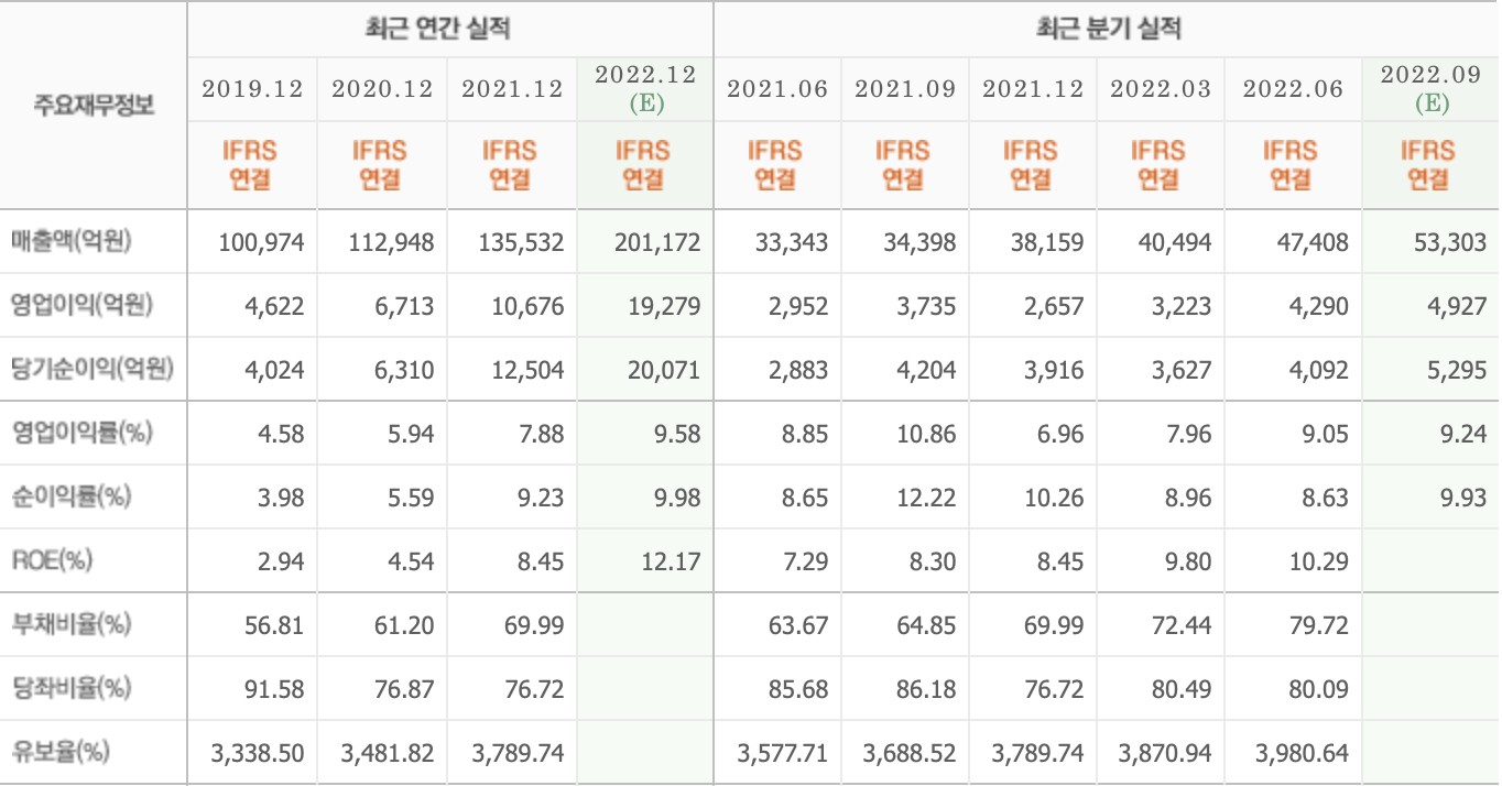 - 2021년 영업이익이 큰 폭으로 증가하셔 영업이익률 7.88%를 기록하였고, 올해 예상 영업이익률도 9.58% 증가 예상하고 있습니다.