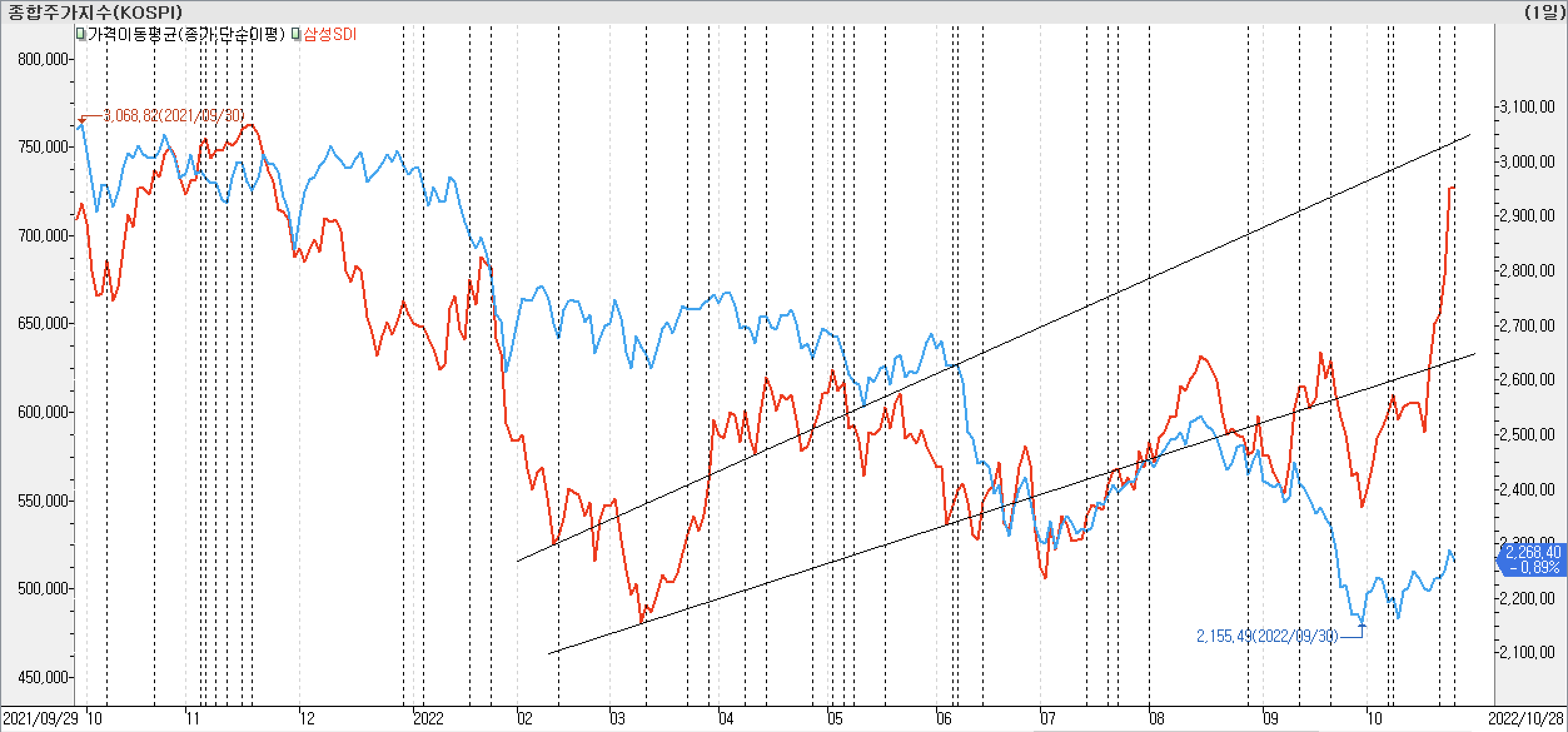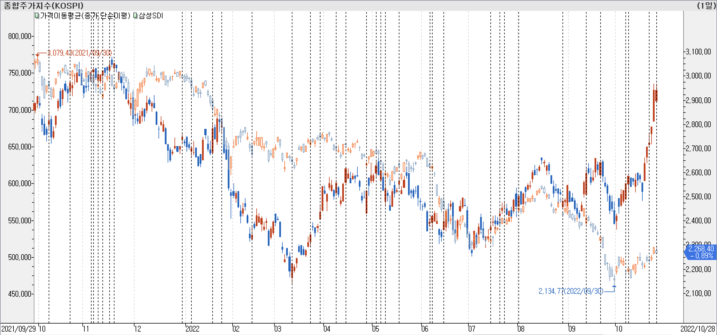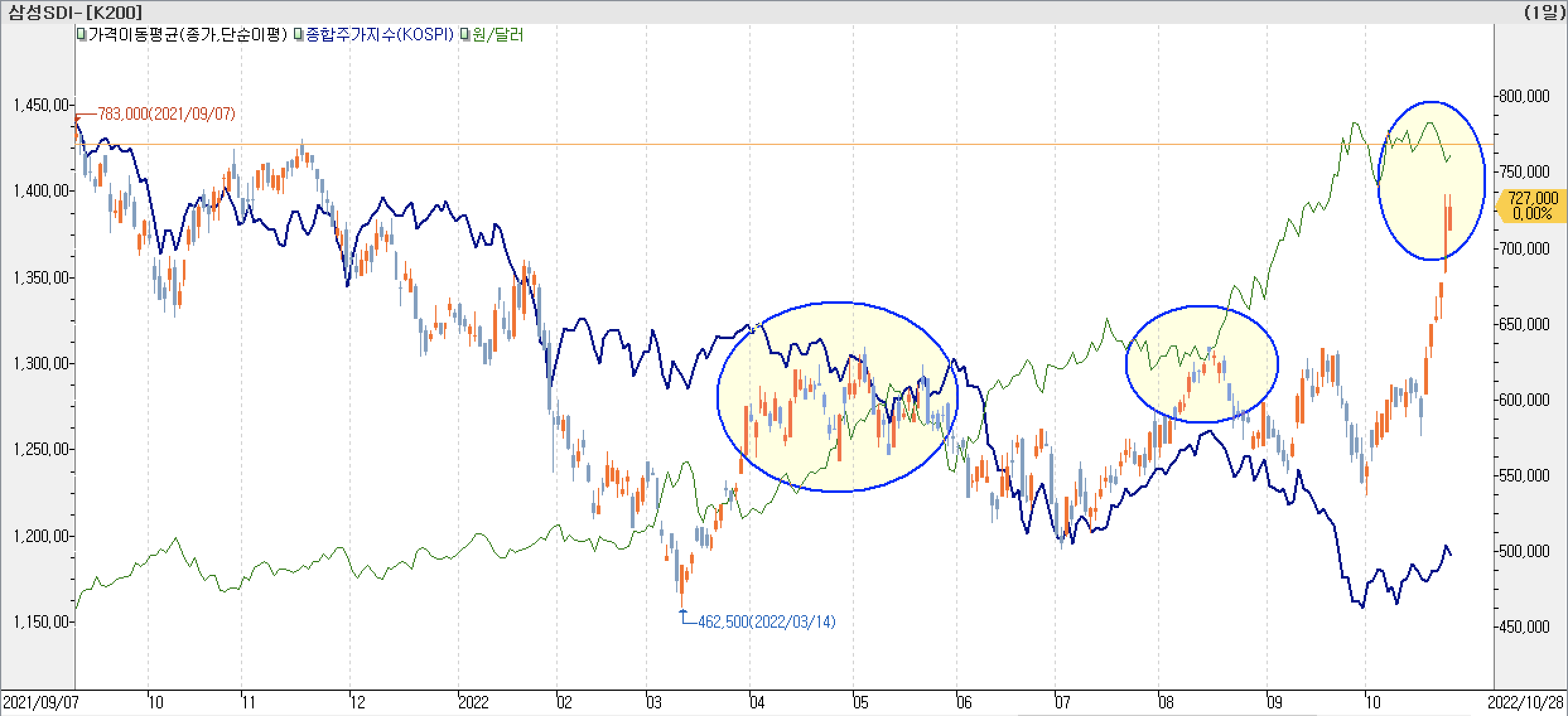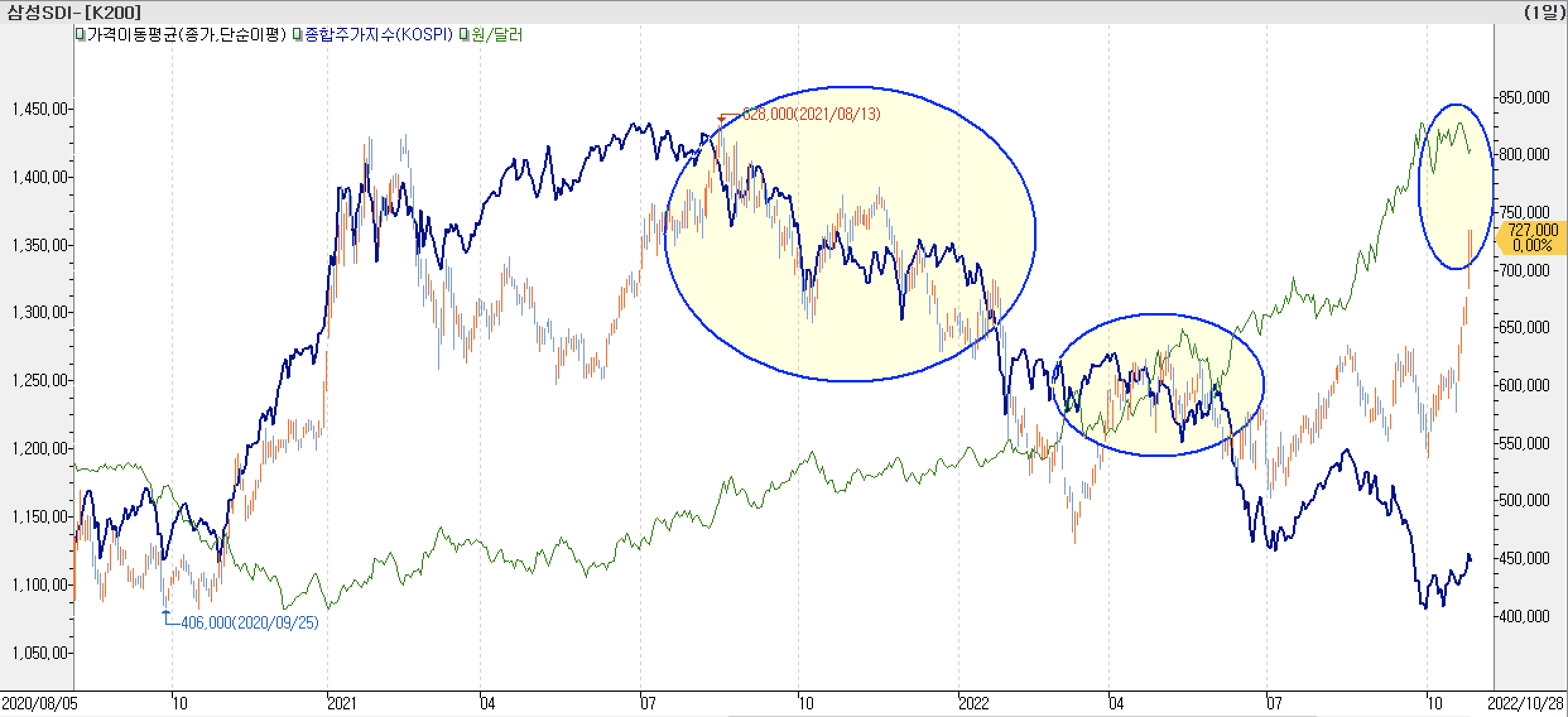 - 280일(1 년 단위) 기준 차트에서 보면 지수가 환율 위에 있을 때는 SDI의 고점 저항 라인을 형성하였으며, 환율과 데드크로스 난 상태에서는 환율이 SDI 주가의 저항 라인을 형성하고 있습니다.