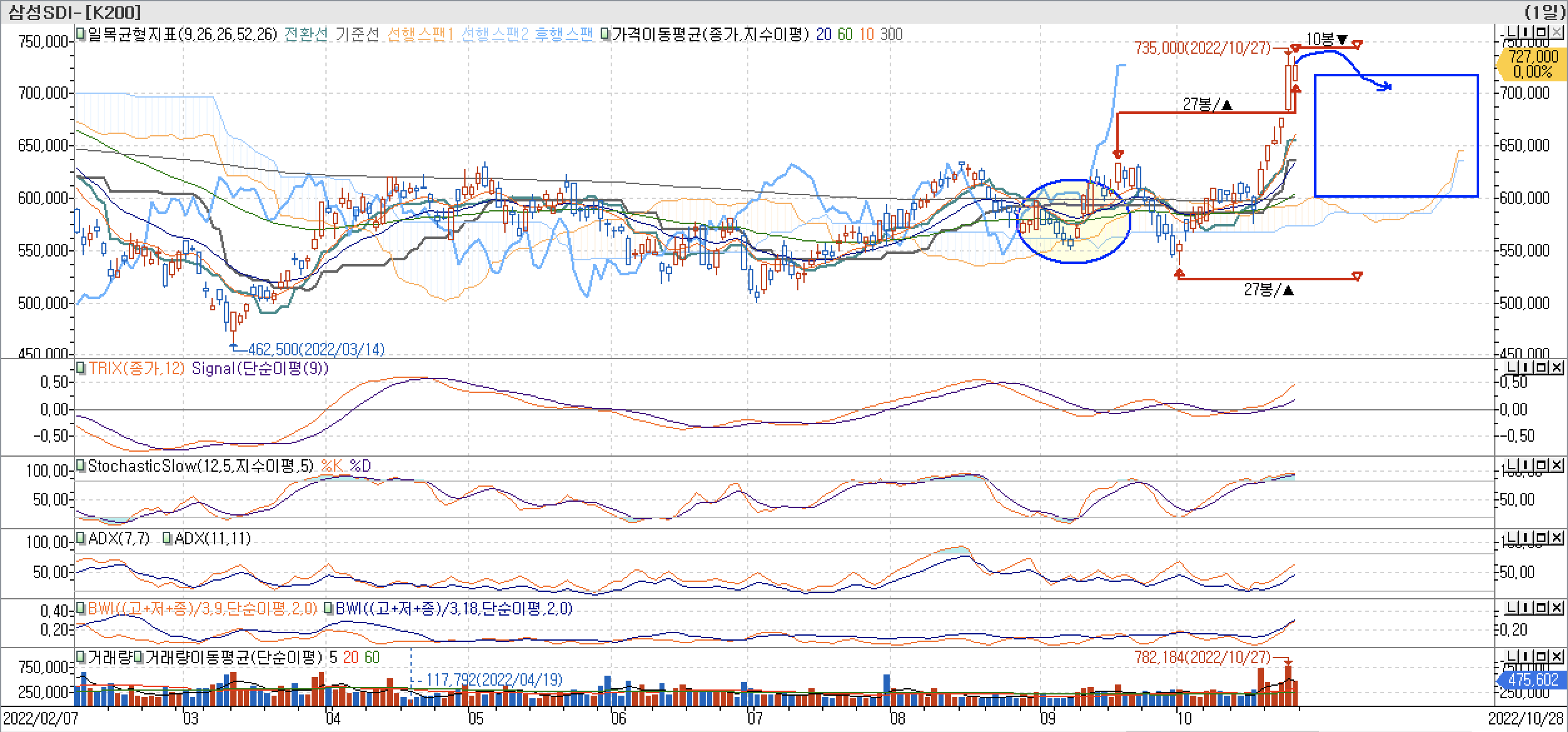 - 삼성전자 이재용 회장 취임 시점에 삼성SDI 3분기 호실적 발표가 나오면서 주가도 같이 상승하는 것으로 보입니다. 하지만 장기적으로는 추가 상승 가능하더라도 지금은 재료 노출 상황이기 때문에 단기적으로 급등한 상태이기 때문에 조정 가능성 커 보입니다.
