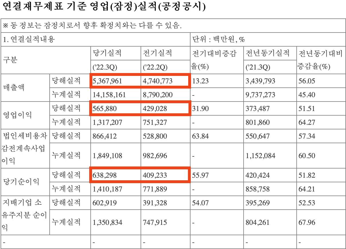 - 10월 28일 잠정 영업 실적 발표에서 5,658억 원(예상 영업이익 4,927억 원), 당기순이익 6,382억 원(예상 영업이익 5,295억 원)으로 예상 실적을 상회하는 결과를 발표하였습니다.