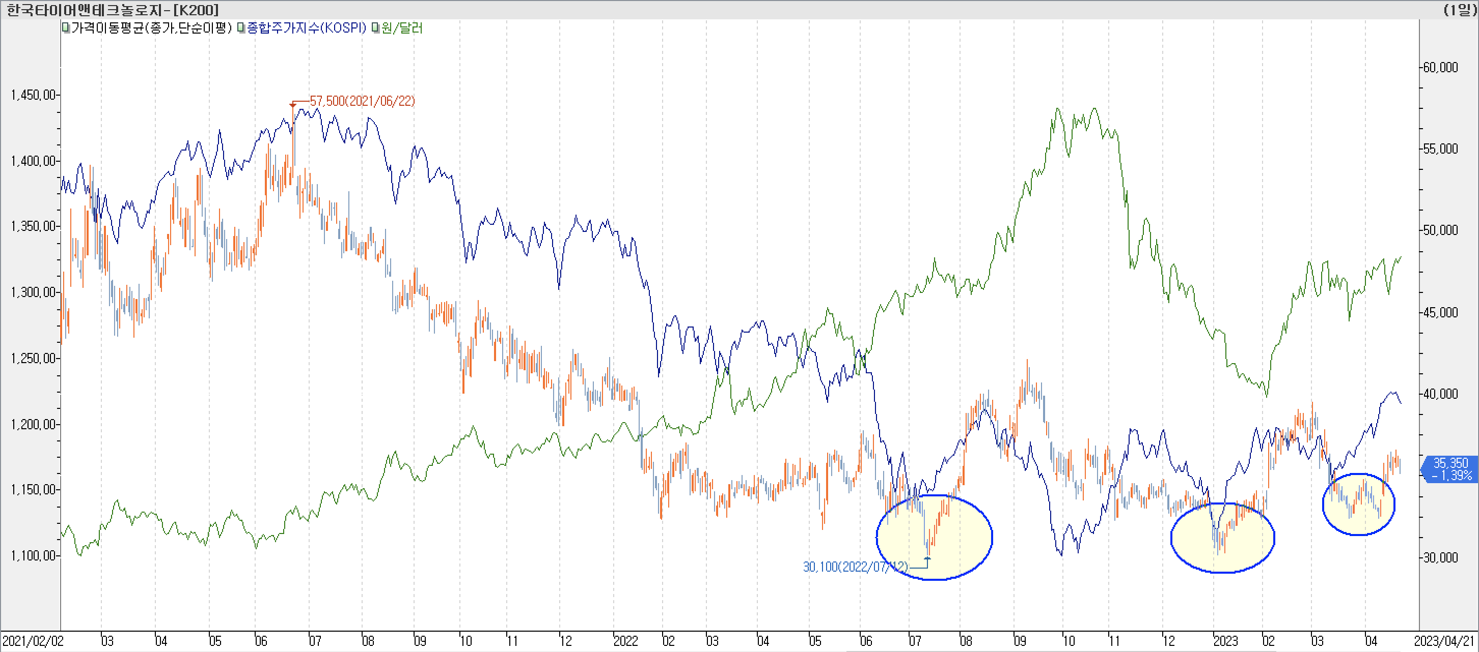 - 2021년 주가 고점 구간에서 한국타이어 앤 테크놀로지의 주가가 여러 번 돌파 시도 하였지만 돌파 못하고, 시장지수 하락 전환 구간에 같이 하락하기 시작하였습니다.