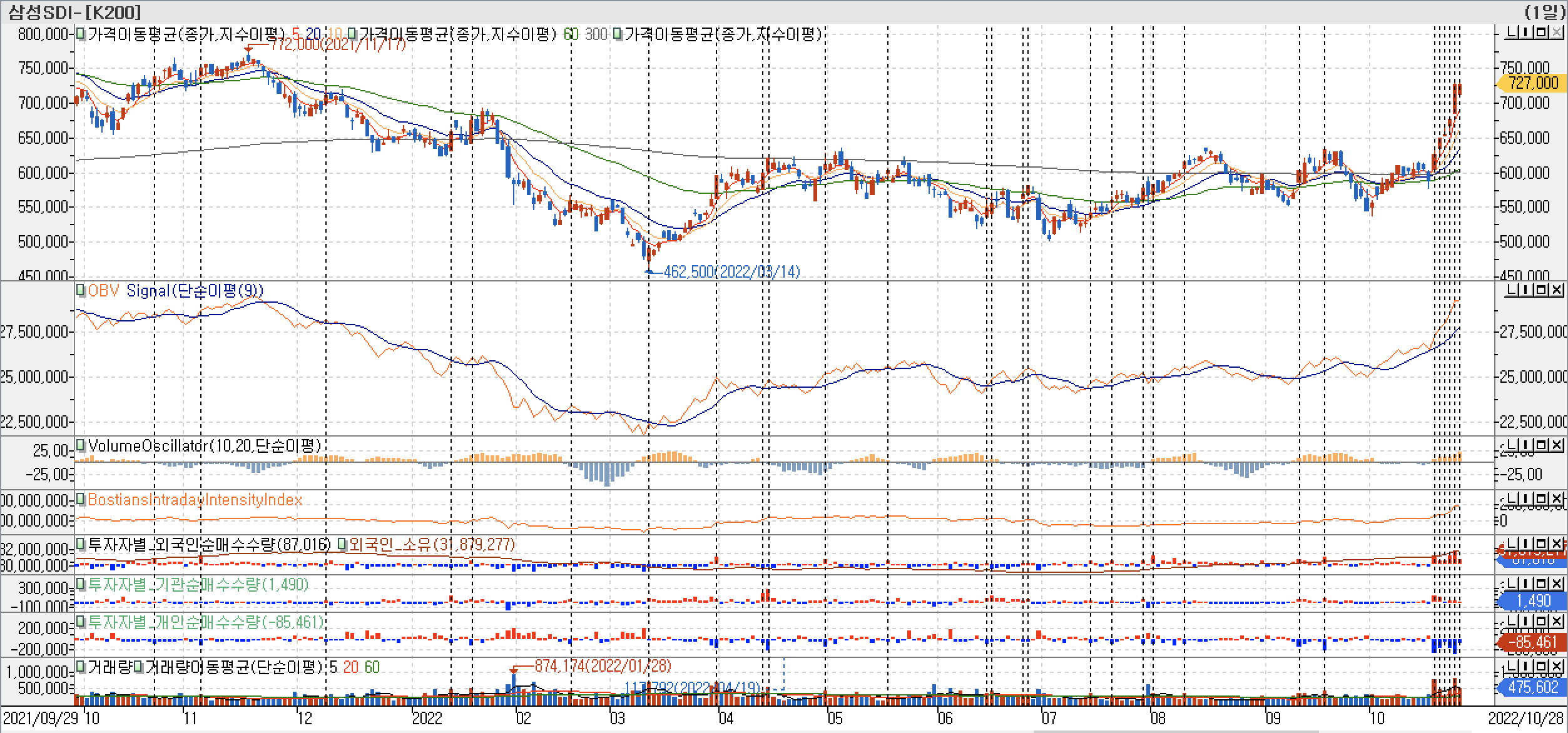- 삼성전자 이재용 회장 취임 시점에 삼성SDI 3분기 호실적 발표가 나오면서 주가도 같이 상승하는 것으로 보입니다. 하지만 장기적으로는 추가 상승 가능하더라도 지금은 재료 노출 상황이기 때문에 단기적으로 급등한 상태이기 때문에 조정 가능성 커 보입니다.