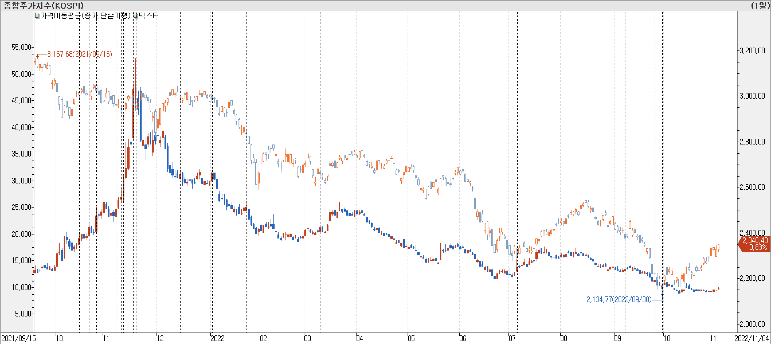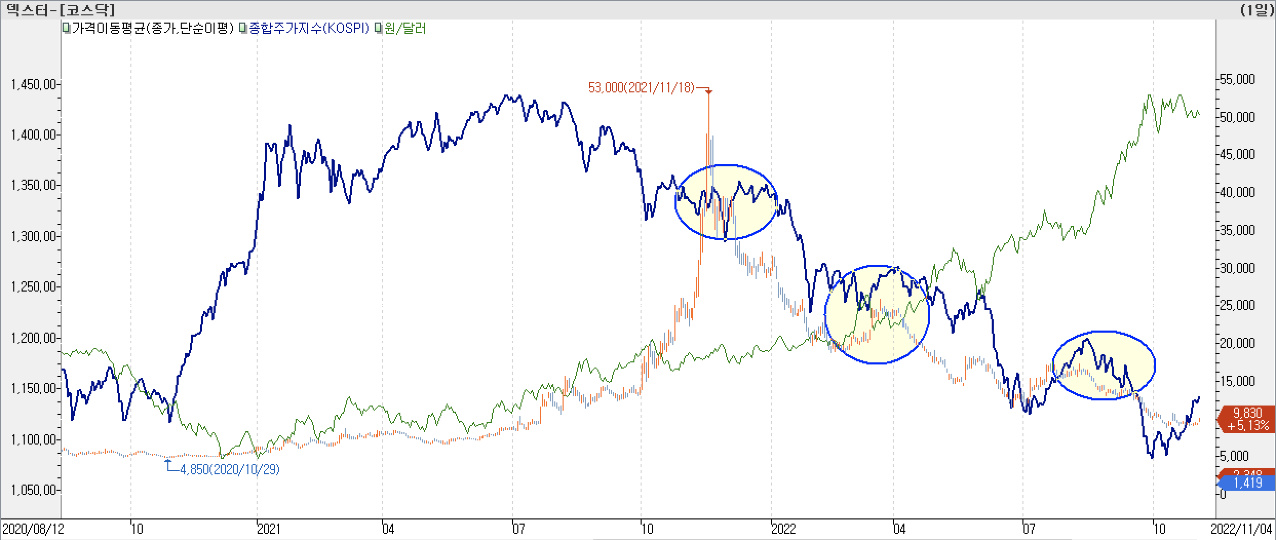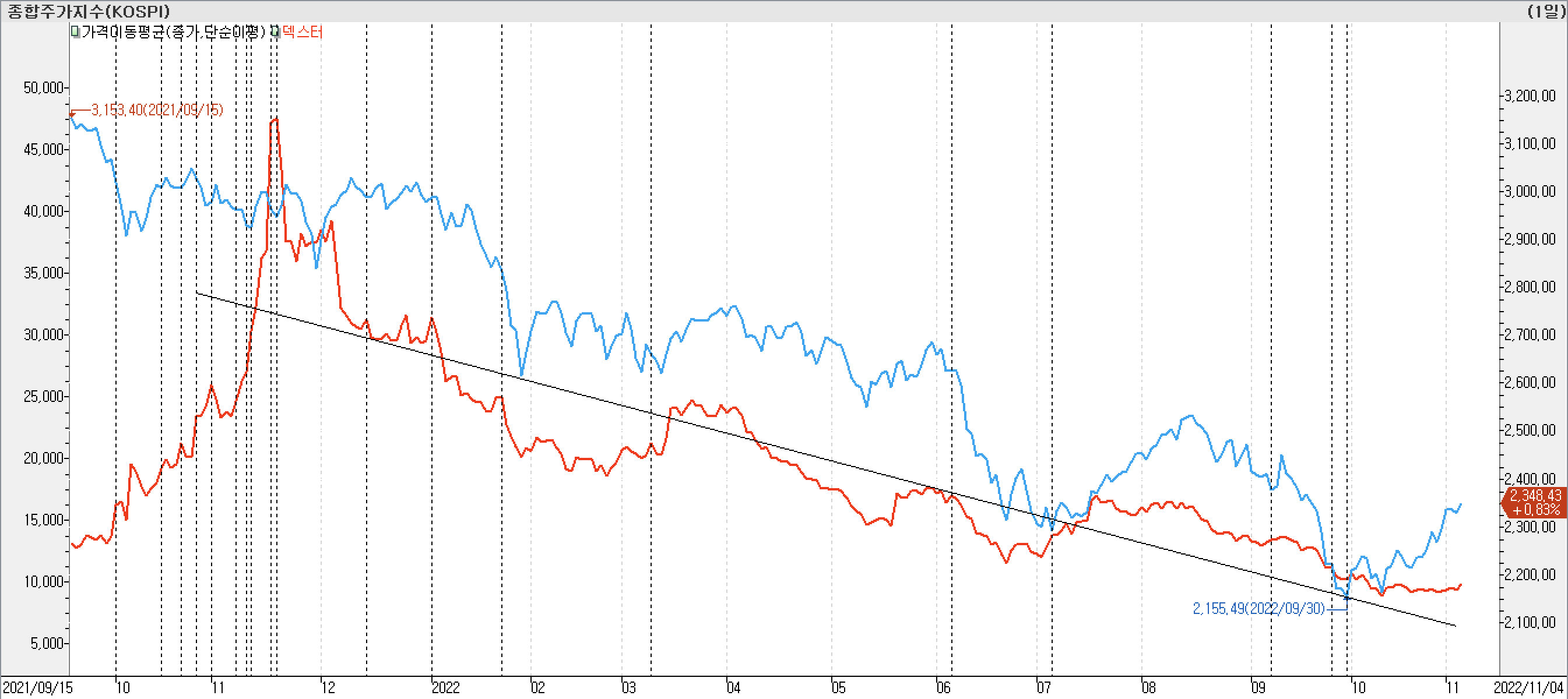 • 종합주가지수 고점 구간에서 환율이 점진적 상승하던 시점에 강한 상승이 발생하였습니다. 지수 급락 구간에 하락하여 환율이 지수와 데드크로스 발생시키는 지점에서 지수 근방까지 상승 후 추가 하락 나왔습니다.