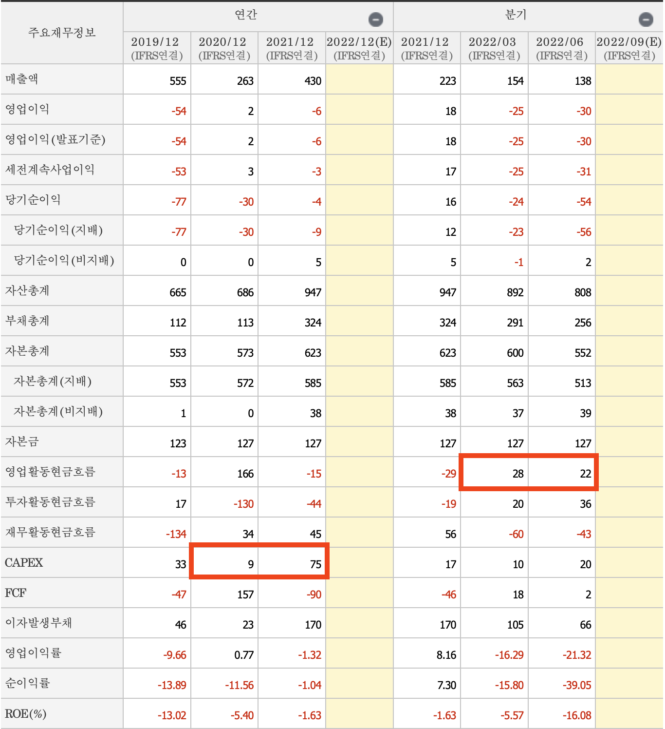 • 실적은 개선되고 있지만 적자 상태에 있습니다. 하지만 실적 개선의 흐름이 유지되면서 점점 좋아지고 있다는 지표를 주요 재무제표상에 나타나고 있습니다.