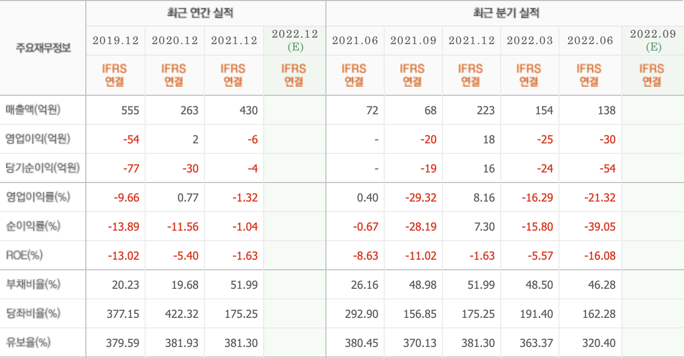 • 2021년 매출액 이 증가하였지만 영업이익 적자 전환하였습니다. 대신 ROE가 2020년 -5.4%에서 -1.63%로 증가하였습니다.