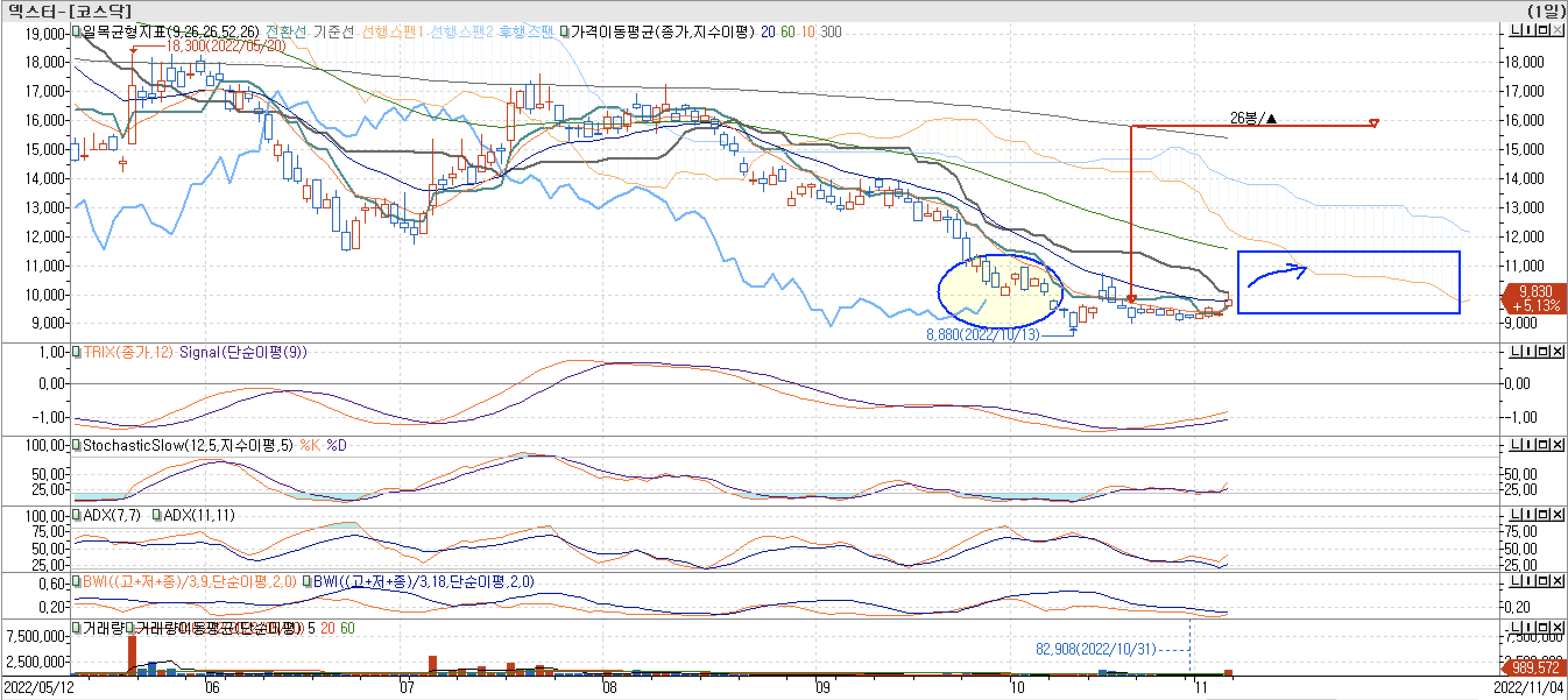 • ADX 지표가 바닥에서 상승하고 있고, BWI 지표도 9, 18 BWI가 동시에 상승 전환하여 반등 신호로 보입니다.