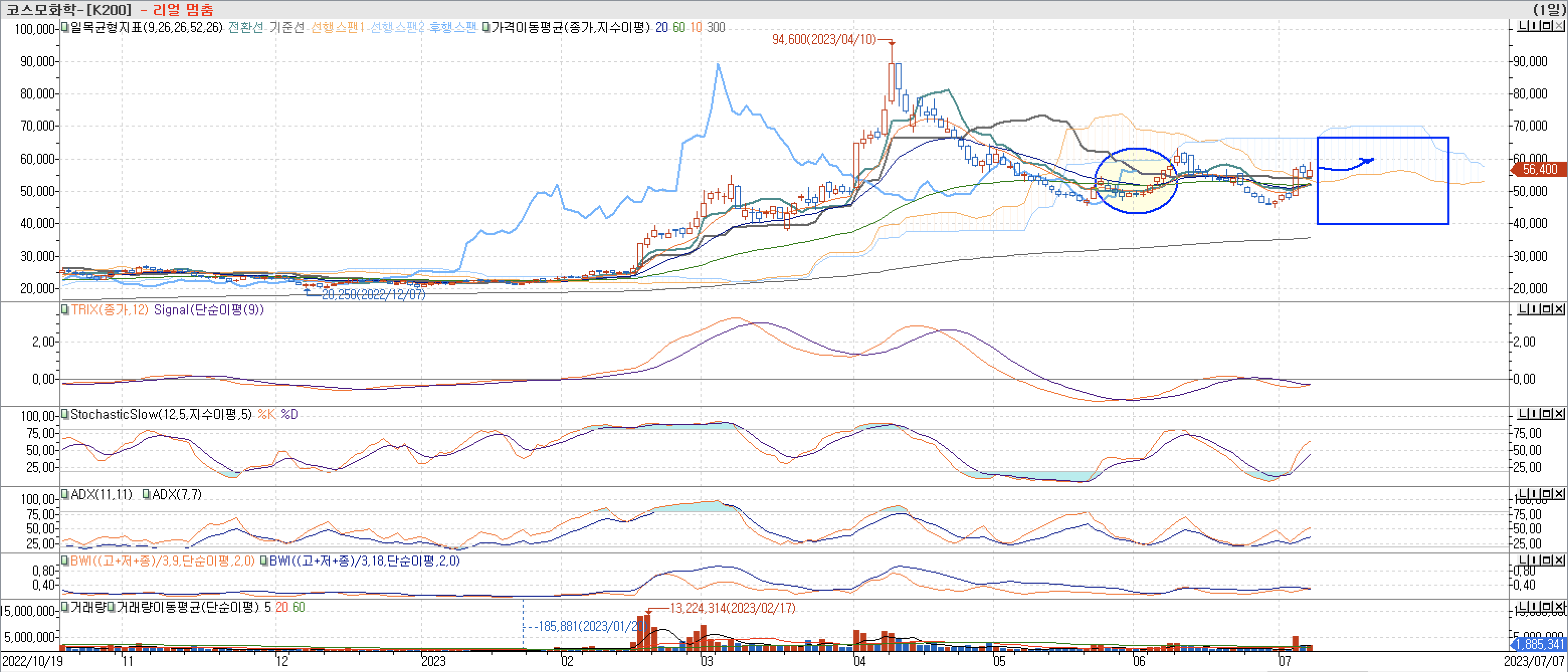 4. 매물대 차트 - TRIX, OBV, VolumeOscillator, BIII-코스모화학