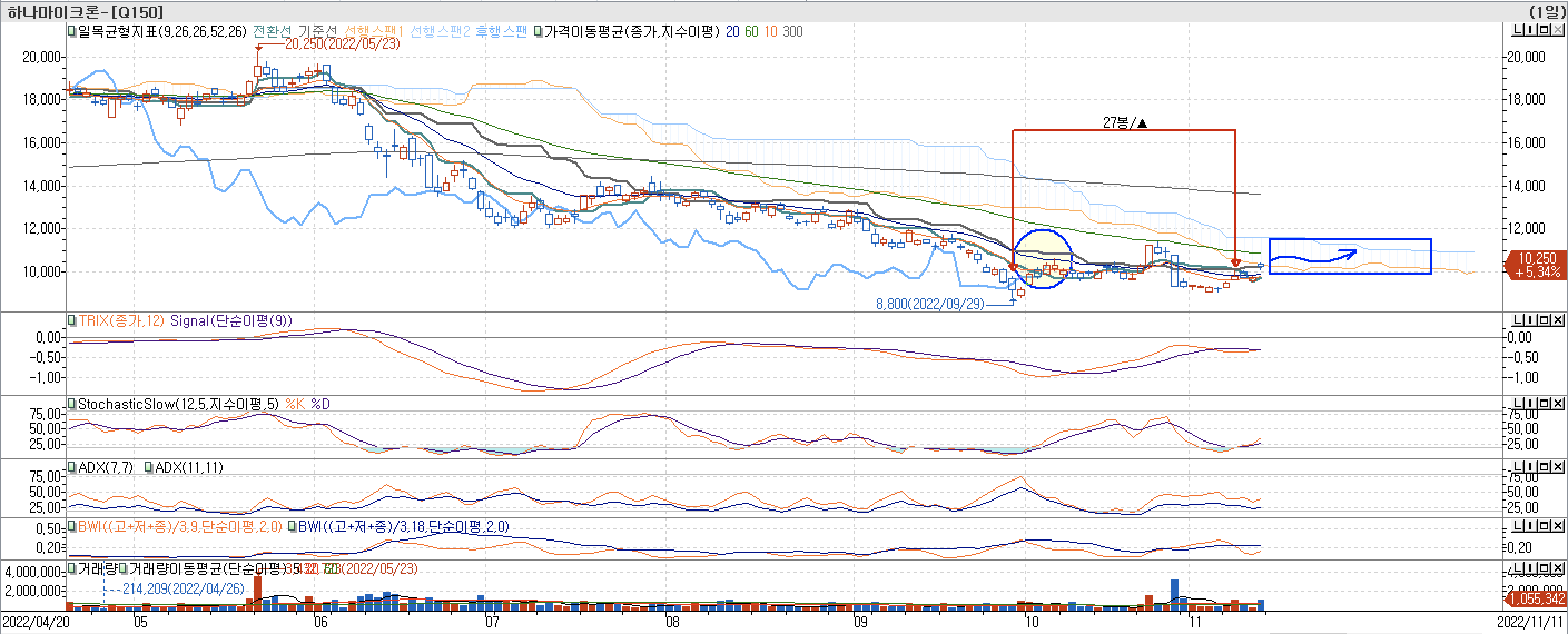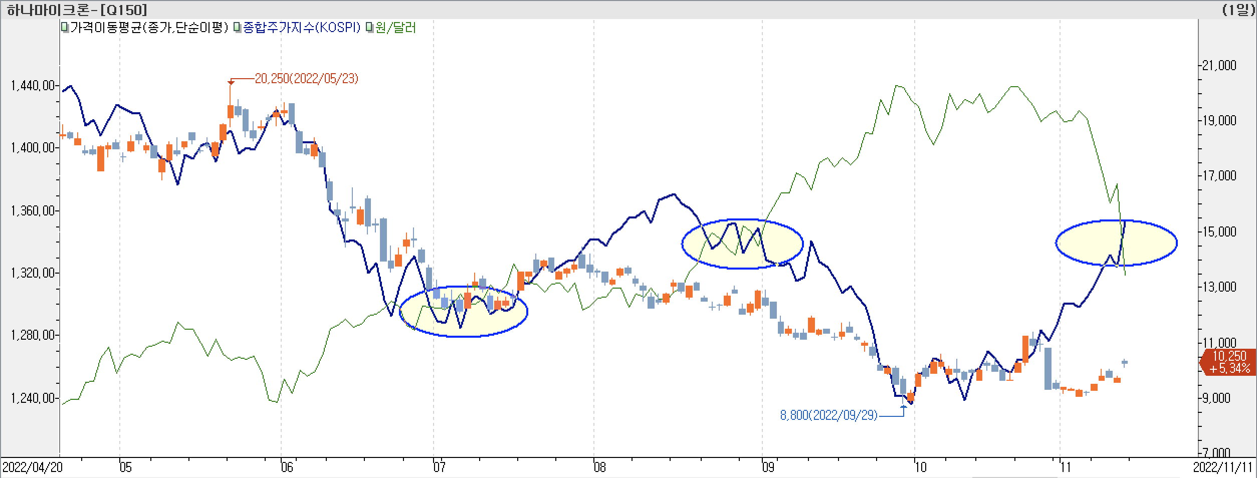- 지수가 환율과 골든 크로스 발생하였고, 하나마이크론은 점진적으로 상승하고 있어 조만간 지수 근처까지 가격을 끌어올릴 가능성도 있어 보입니다.