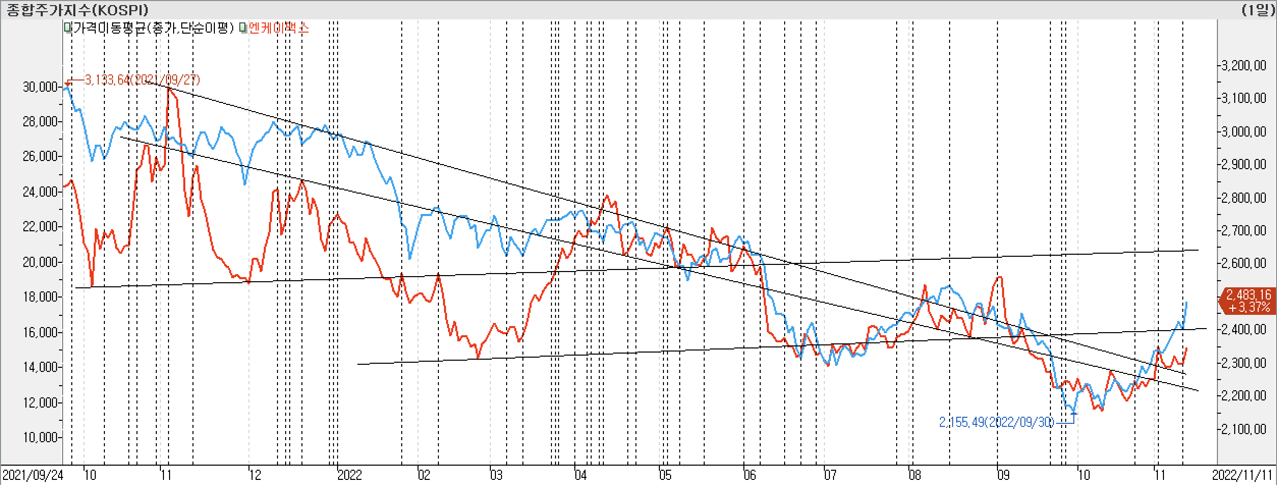 - 종가선 차트에서 보면 하락 추세 터널에서 최근 상향 돌파 한 후 지지받고 반등 중입니다.