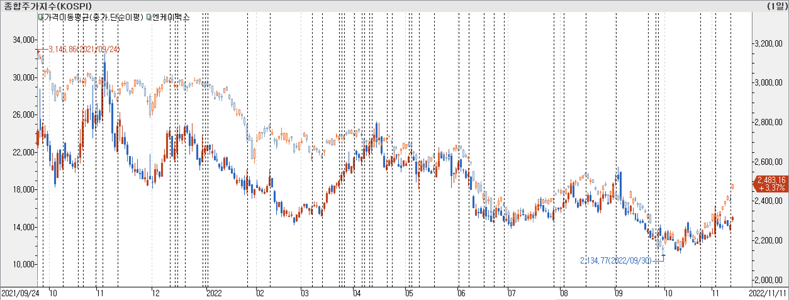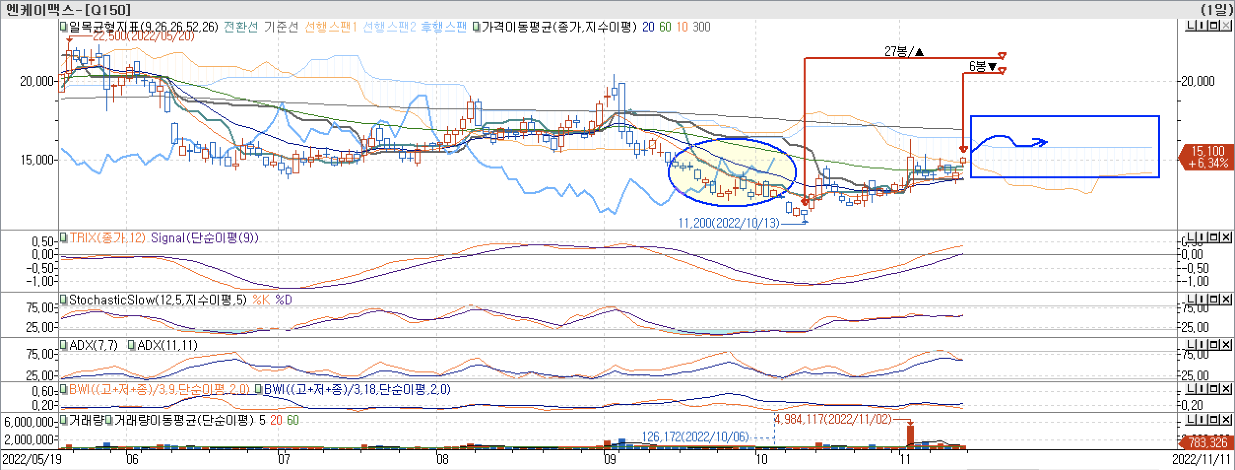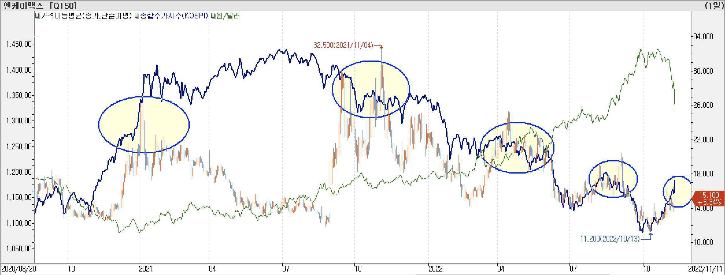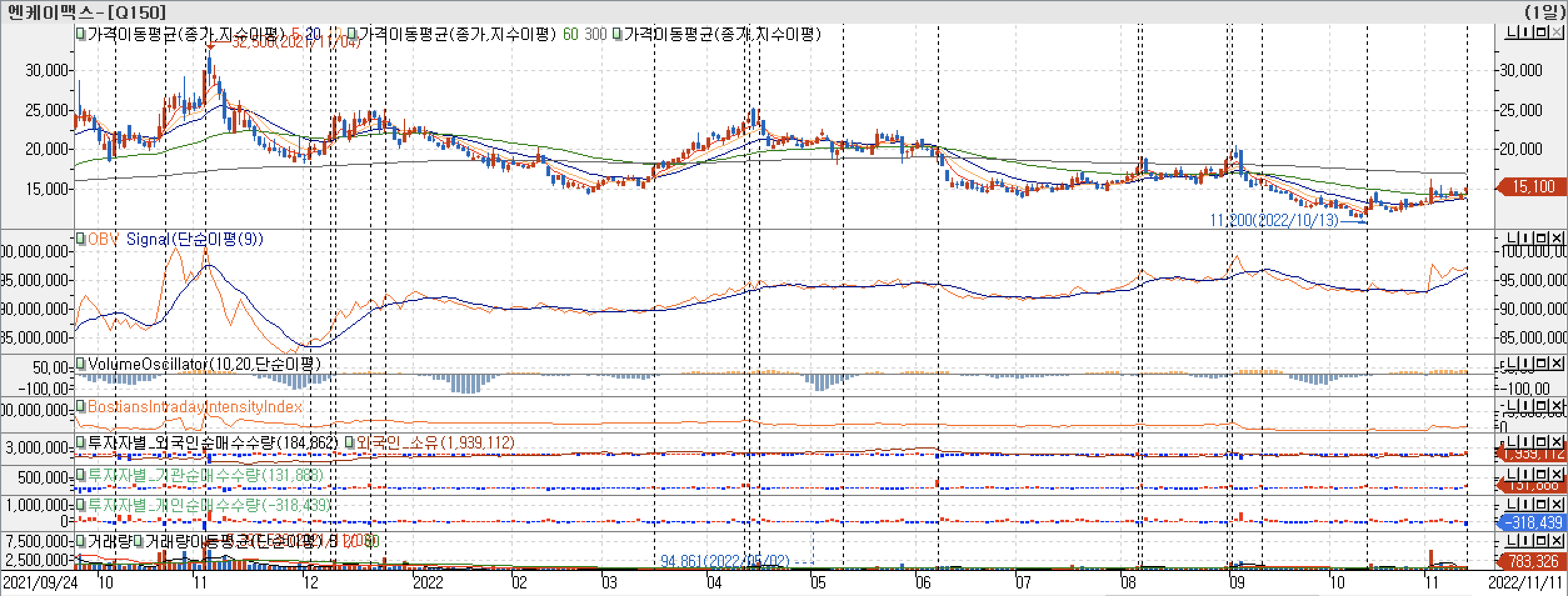 - 1년 기준(280개 봉 기준) 으로 엔케이맥스의 주가 흐름을 보면 지수가 상승할 때 같이 상승하였고, 지수 하락 구간에서도 지수 상당을 강하게 돌파하면서 조정받았습니다.