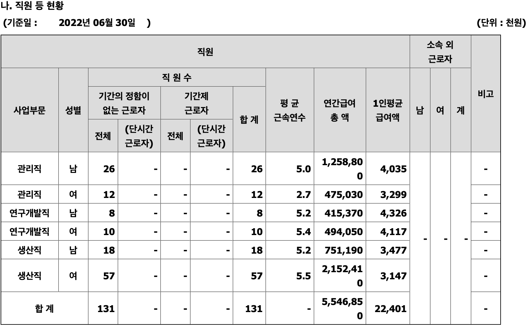 - 연구개발직 18명 정도로 평균 근속 연수가 5년이 넘습니다. 치료제 개발에 필요한 연구 개발인력의 근속 연수가 5년 이상이고 연봉이 평균 6천만 원 수준의 인력들을 유지하고 있어 치료제 개발에 충실한 것으로 보입니다.
