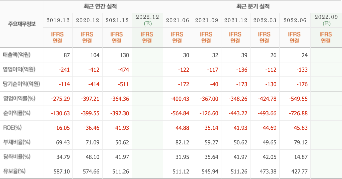 - 매출액이 100억 이상이지만 치료제 개발비로 영업이익은 적자 상태입니다.