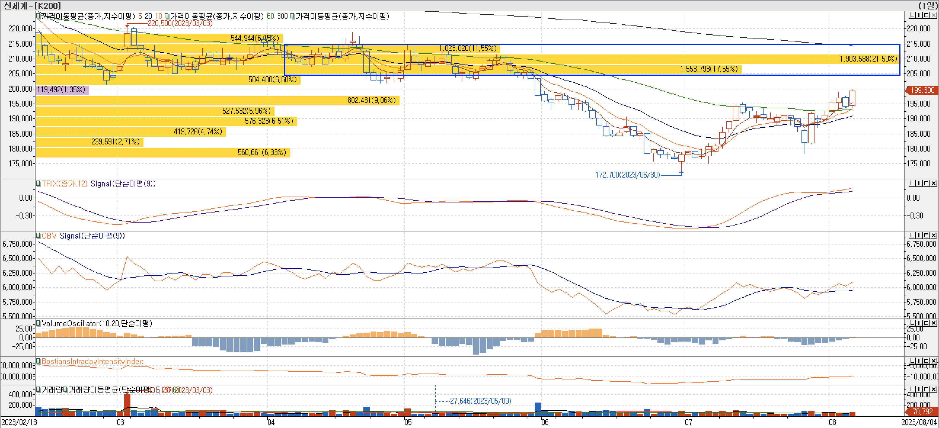 - 신세계 주가가 60일 이평선위로 올라오면서 TRIX지표도 0선 돌파 후에 지속 상승 하고 있습니다. 매물대 차트에서 보면 300일 이평선 하단에 가장 두꺼운 매물대가 형성되어 있으며, 신세계의 지금 가격대의 하단에 형성된 매물대는 상대적으로 얇아진 상태이기 때문에 300일 이평선 하단까지 상승하는데 저항이 약할 것으로 보입니다.