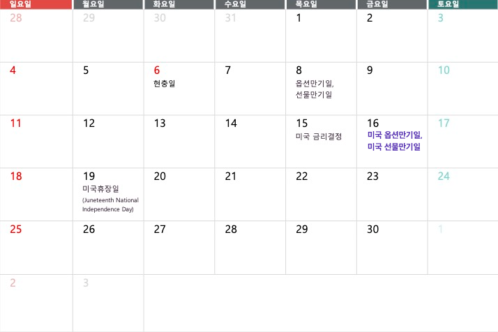 | 미국 일정 | 6.15(목) 미국 금리결정, 6.16 (금) 선물만기일, 옵션만기일, 6.19 (월, 휴장) Juneteenth National Independence Day |