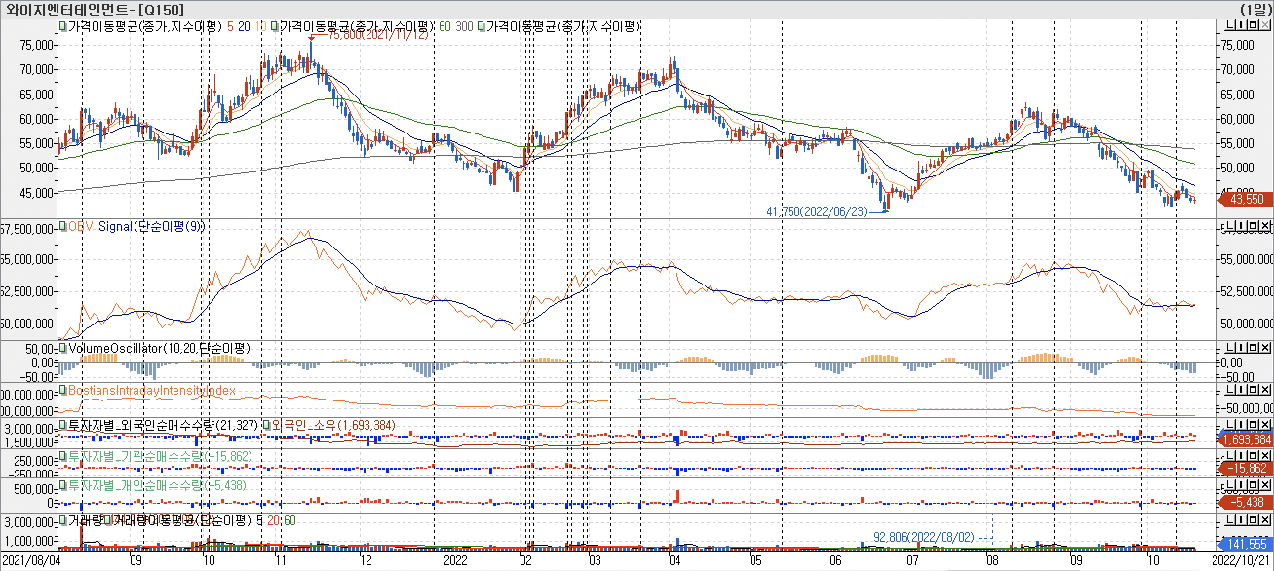 - 대형주이기 때문에 OBV 지표에서 매매활성도가 강하게 나오는 부분과 약세로 전환 되는 과전에서 주가의 커플링이 상당히 유사하게 나오고 있습니다.